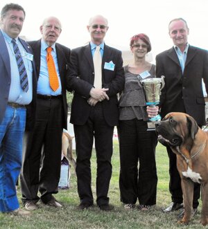Oltre a queste soddisfazioni, comunque, ci son altri due magnifici ed EVENTI UNICI, che hanno distinto il 2012 per la sua importanza: il primo di questi è il 3° PODIO del mio SHIN al RADUNO del Club Italiano del Molosso (C.I.M.) nel BEST IN SHOW FINALE (vedi foto con i giudici); è la prima volta da quando il tosa è in Italia, che un soggetto di razza Tosa si classifica nei primi 3 al raduno nazionale del C.I.M.!!!